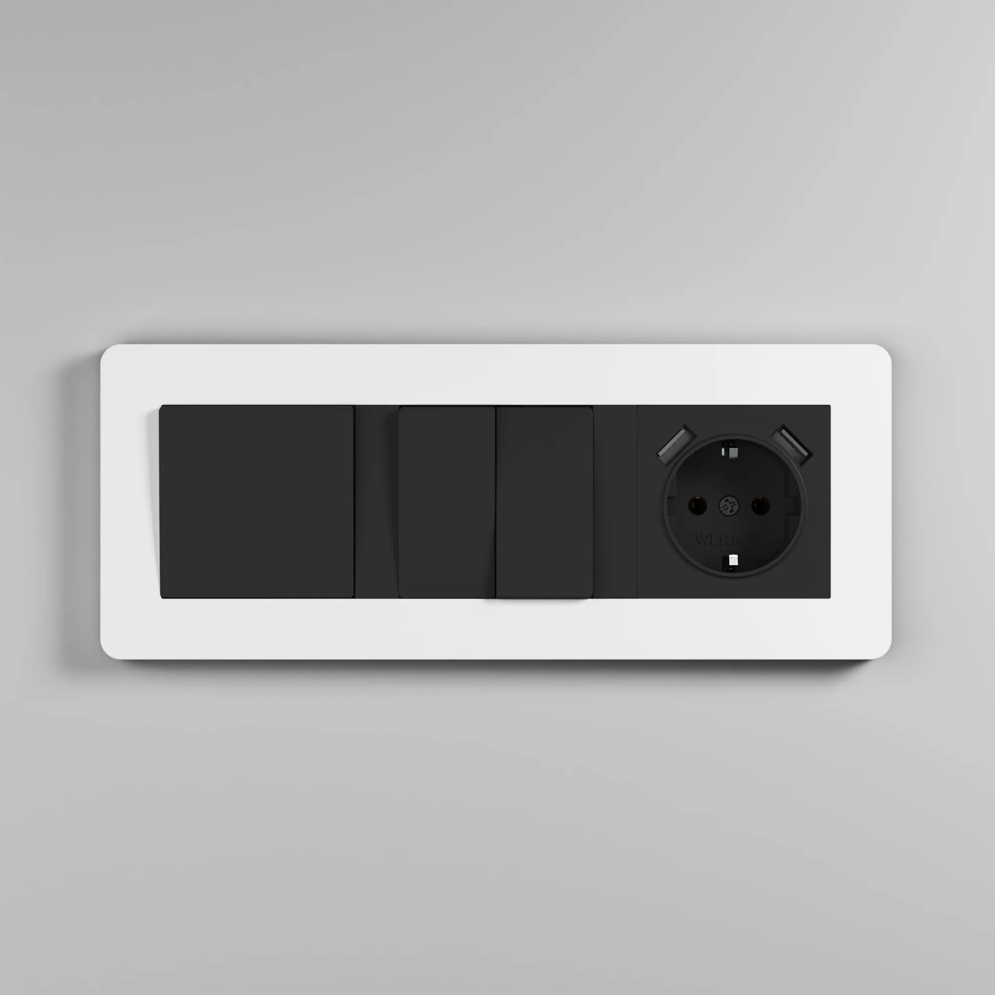 Коллекция Split переосмысливает привычные электроустановочные изделия, превращая их в элементы современного декора. Благодаря продуманному сочетанию цветов, форм и тактильных ощущений, рамка белый/чёрный становится не просто обрамлением, а визуальным фокусом на стене.