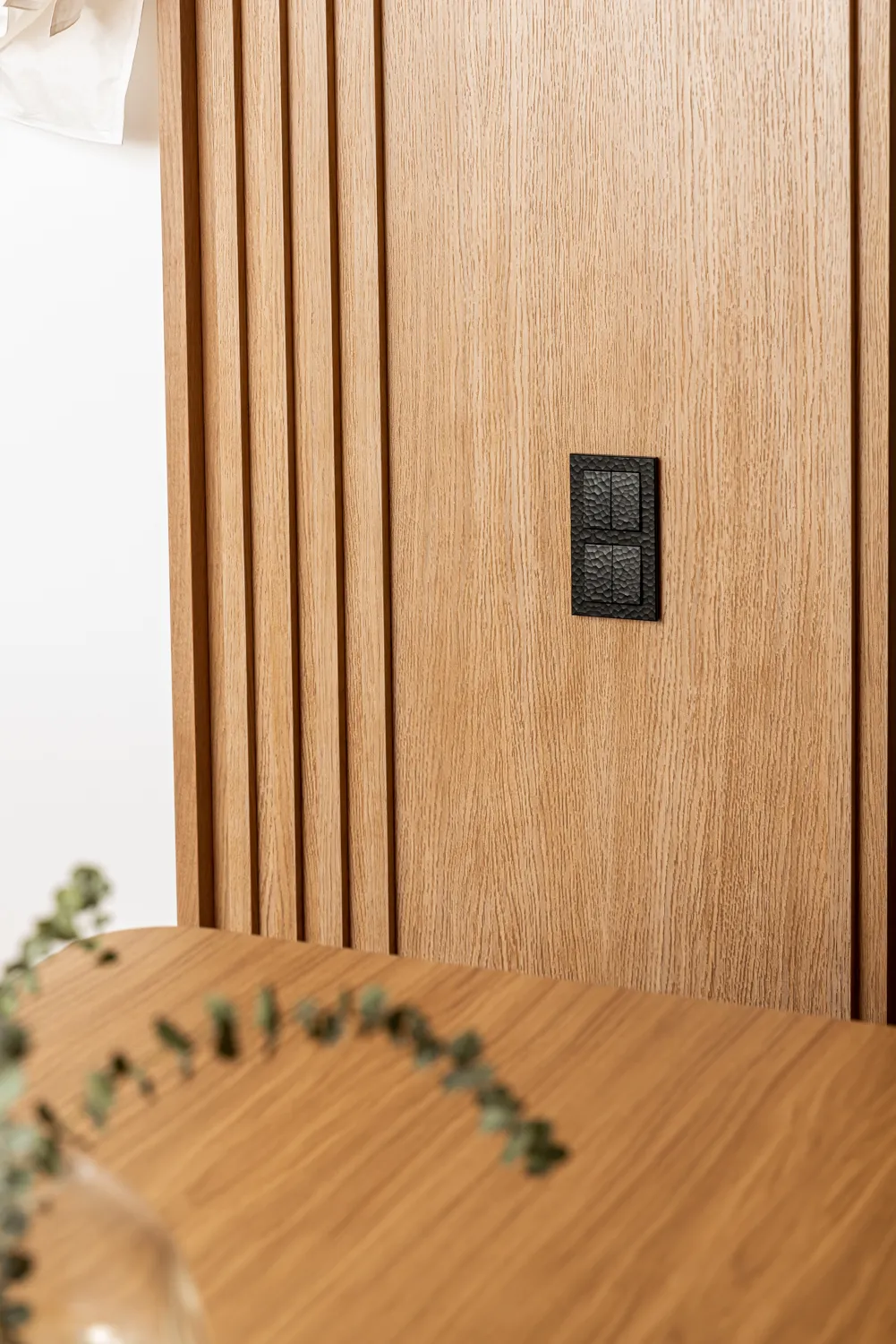 Интерьер поражает своей многогранностью: каждая деталь продумана до мелочей. Особое внимание уделялось техническим решениям — для проекта были выбраны выключатели и розетки серии Hammer. Их дизайн вдохновлен природной текстурой камня, но выполнен из ударопрочного и негорючего поликарбоната. Благодаря уникальной 3D-фактуре, они создают эффект ручной работы, будто рисунок выбит молотком. Такие элементы не только функциональны, но и стильно дополняют интерьер, подчеркивая его натуральность .