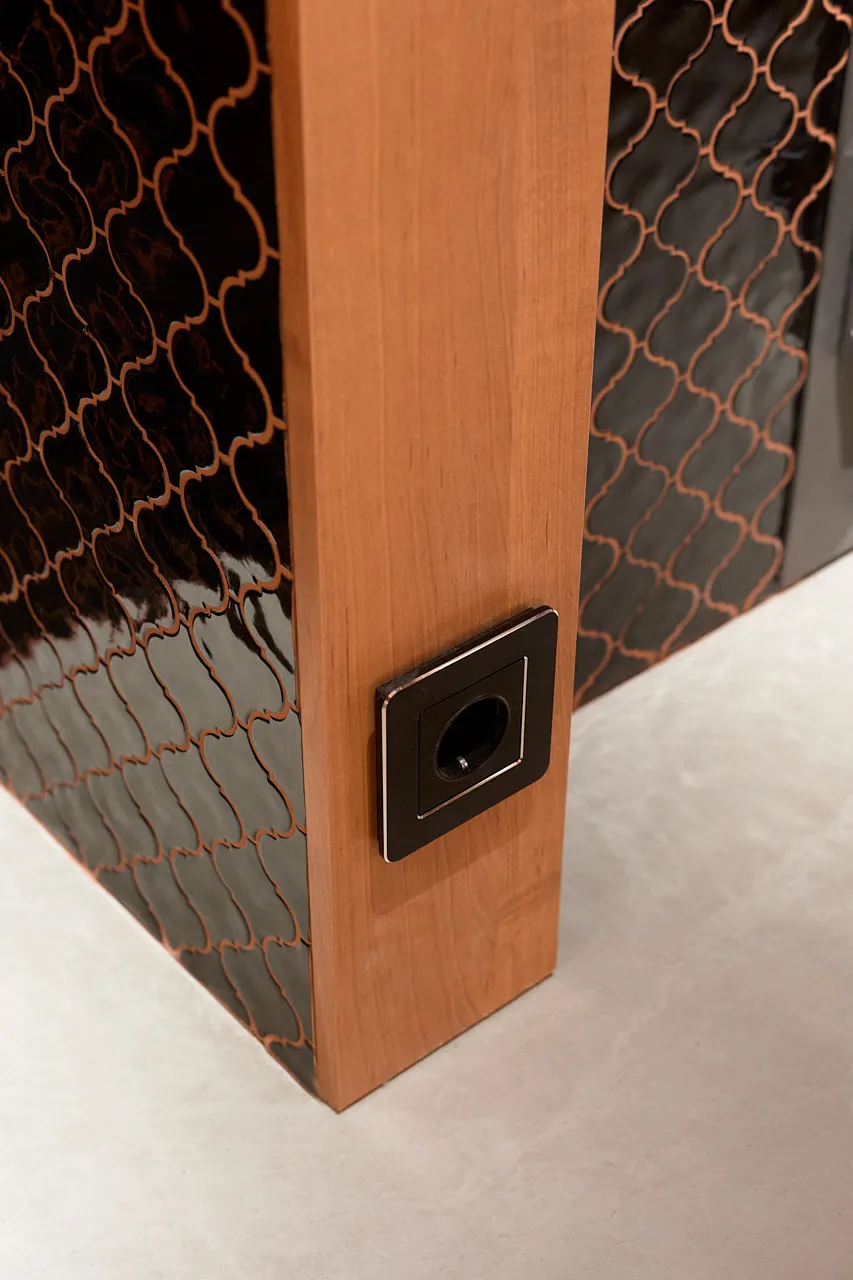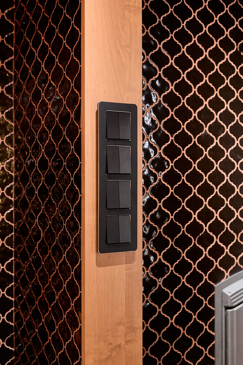Особое внимание уделили освещению. В помывочной зоне смонтировали споты из алюминия, устойчивые к влаге, что гарантирует их долговечность даже в условиях высокой влажности. На потолке в зоне отдыха закрепили накладной шинопровод с четырьмя "умными" светильниками, которые позволяют регулировать освещение в зависимости от настроения и времени суток. Эти решения стали ключевыми для создания комфортной атмосферы.